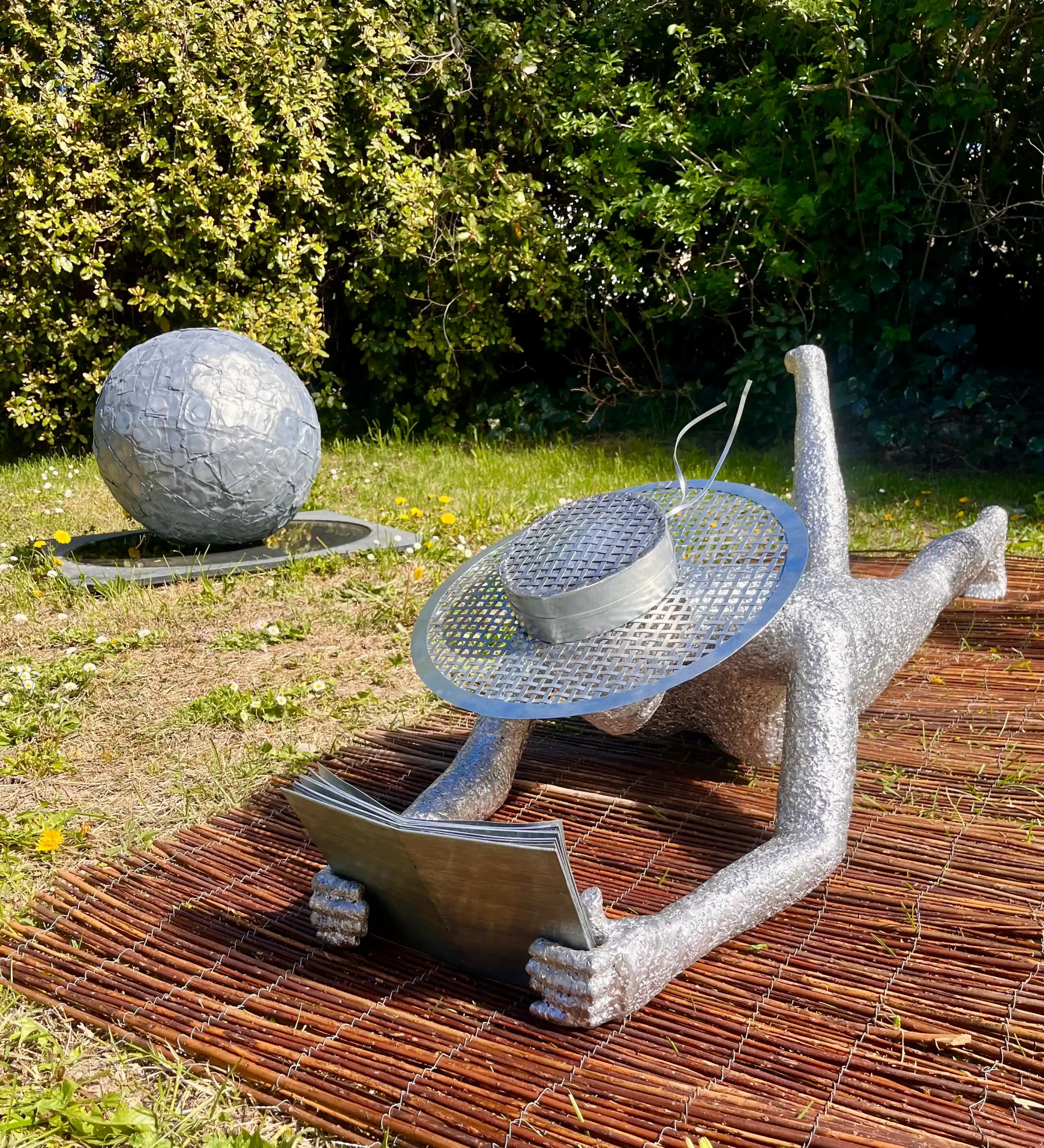 Cette sculpture met en scène femme absorbée dans un geste simple et familier : la lecture. Réalisée en zinc et en étain, cette sculpture de jardin présente un corps stylisé, à la fois dense et vulnérable, comme suspendu dans un instant d’intimité.
