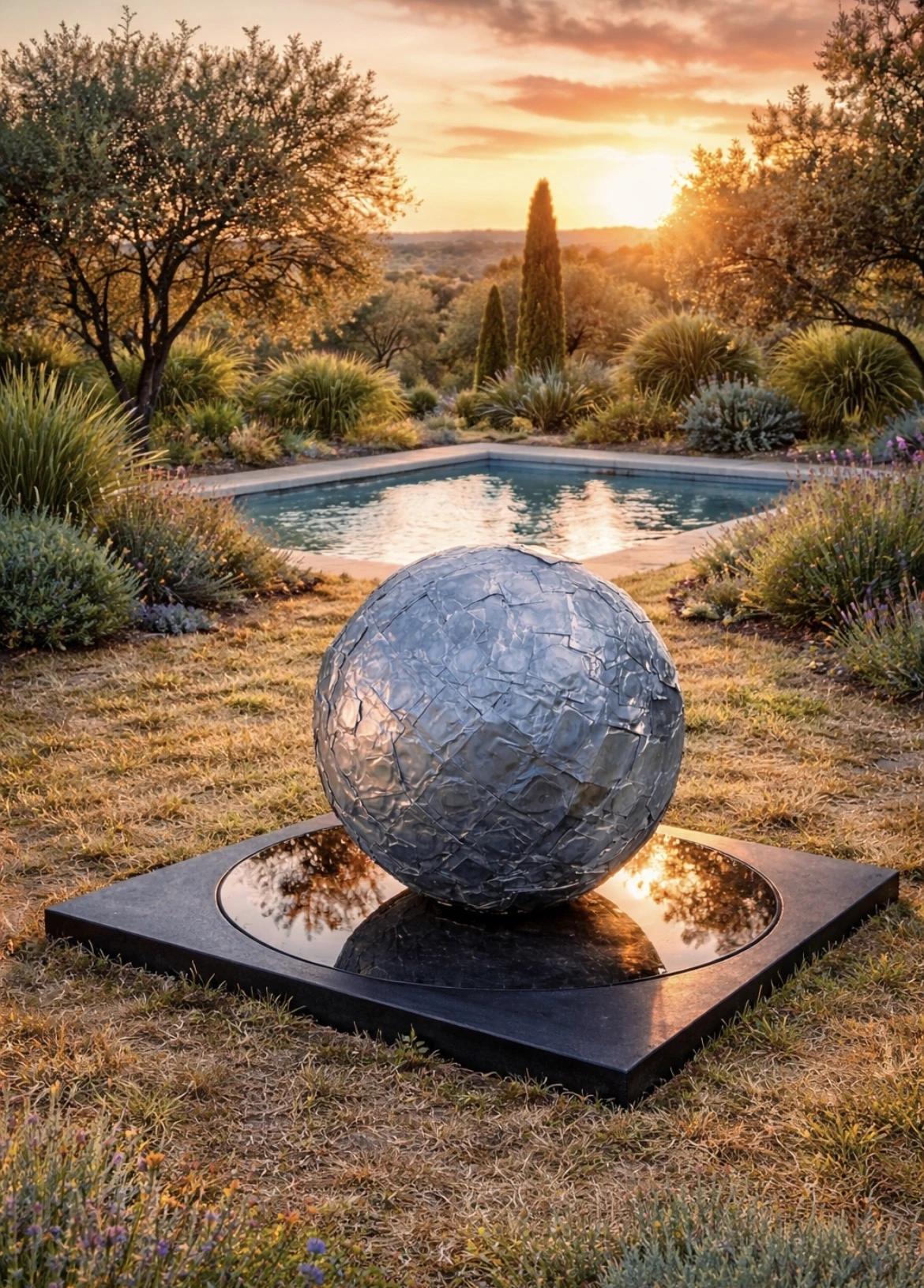 Cette sculpture de jardin, réalisée en zinc prend la forme d’une sphère fragmentée posée en équilibre. Sa surface irrégulière capte la lumière tandis que son reflet crée un jeu subtil entre matière et illusion, invitant à une contemplation silencieuse.
